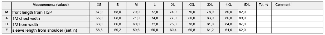 Širok kroj, stoječ ovratnik, 2 stranska žepa, dostop za dekoracijo na robu, pranje do 30°