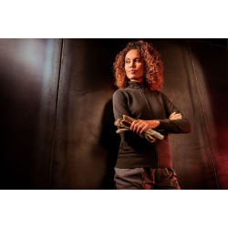 Pokončen ovratnik iz osnovnega blaga, trak v ovratniku, zadaj pod ovratnikom polkrog, obešalnik znotraj v stranskem šivu, elastični robovi, spredaj dva žepa z zadrgo, spredaj dolga skrita zadrga v barvi blaga, izjemno gladka površina, s trakom ojašani ramenski šivi, dvojni šivi, Frotir, pralno do 60°, primerno za sušenje v sušilnem stroju, primerno za industrijsko čiščenje