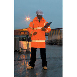 Vodoodporno, 1.000 mm vodnega stolpca, skrita kapuca v ovratniku, elastičen rob, zavihek proti nevihti na zadrgi, 2 zunanja žepa, 1 notranji žep, varjeni šivi, dostop za dekoracijo na robu, trpežna in vzdržljiva, odporna na veter, EN ISO 20471:2013, certifikat razreda 3, 50 mm široki všiti varnostni trakovi